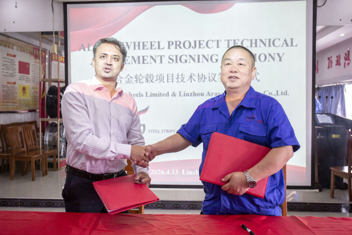 4月13日,柳州。柳州一阳科技股份有限公司副董事长、总经理吴振国与印度SSWL集团董事营运长Aditya Dixit正式签署合金轮毂项目技术协议。这是即2月13日,香港,在力劲科技集团总部及各方代表的共同见证下,柳州一阳与印度SSWL正式签署合金轮毂项目合作签约协议后取得的又一实质性重大进展。这标志着柳州一阳“向海图强”战略迈出关键一步,从单纯的产品出口升级为技术与管理标准的整体输出,吹响了进军全球高端制造服务市场的冲锋号。